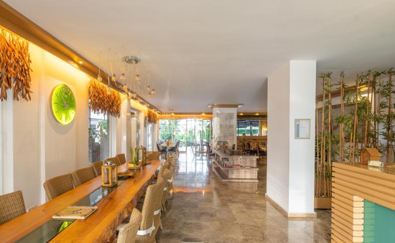62 pokojů umístěných v hlavní budově, vstupní hala s recepcí, hlavní restaurace, bar, lékař, půjčovna aut, bazén, dětský bazén, terasa na slunění, lehátka a slunečníky zdarma.