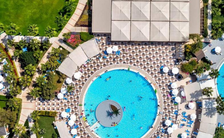 | Hotel byl otevřen v roce 1988, v roce 2018 prošel velkou rekonstrukcí a modernizací. Areál tvoří hlavní vícepatrová budova s centrální částí uprostřed a dvěma ubytovacími křídly zaoblených tvarů. V přední části je pak velká zahrada s areálem bazénů, která pak přechází přímo na hotelovou pláž. Uvítá Vás prostorná a elegantní vstupní hala s recepcí, lobby, výtahy a směnárnou. Vnitřní prostory dále mají společenskou místnost, zasedací místnost, business centrum, obchodní arkádu, hernu, dětský koutek, knihovnu, salónky aj. Potěší hotelové Spa centrum s vnitřním bazénem, saunou, vířivkami, hammamem, možností masáží a kosmetických procedur. Stravování obstarává hlavní bufetová restaurace a další 4 tematické a´la carte restaurace. K posezení poslouží několik vnitřních i venkovních barů, včetně baru na pláži. Venkovní areál Vám nabídne dva velké bazény, samostatný dětský bazén a bazén se skluzavkami se samostatnou částí pro děti. Všechny jsou obklopeny slunečními terasami s lehátky a slunečníky (v ceně, i na hotelové pláži). K pobavení hotel pořádá pestrou škálu animačních programů pro všechny věkové kategorie (soutěže, kurzy, vystoupení, taneční večery aj.). Nechybí dětský klub. Dále budete mít k dispozici tenisové kurty, basketbal, plážový volejbal, šipky, kulečník, stolní tenis a mnoho dalšího. Samozřejmostí je dobře vybavené fitness centrum. Na pláži lze využít nabídky střediska vodních sportů, rovněž je možnost rezervovat se přes recepci pro nedaleké golfové hřiště. Parkování pro hosty je samozřejmostí. |