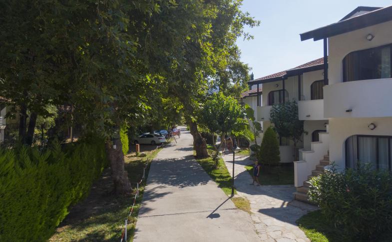 70 pokojů, hlavní budova a několik menších budov v zahradě, vstupní hala s recepcí, restaurace s terasou, bar, minimarket, čistírna a prádelna, půjčovna aut, v zahradě bazén s dětskou částí a terasou na slunění, lehátka, slunečníky a osušky zdarma.