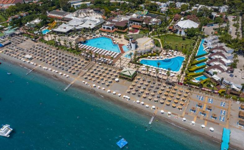 | Hotel je vsazen do hezké zahrady, areál lemují vzrostlé palmy. Tvoří jej několik menších budov roztroušených v zadní části areálu, přední část tvoří bazény a postupný přechod na pláž (soukromá o délce 300 m) s dvěma dřevěnými moly (lze využít ke vstupu do moře). Uvítá Vás vstupní hala s recepcí, lobby a výtahy. Dále budete mít k dispozici společenské prostory, hernu, business centrum, obchůdky, směnárnu, knihovnu, kadeřnictví a další. K relaxaci je zde sauna, turecká lázeň, vířivka. Stravování zajišťuje hlavní bufetová restaurace, dalších 5 a´la carte tematických restaurací (turecká, rybí, italská, asijská, steak ), dále fast food corner a pattiserie. K posezení u nápoje je zde celkem 9 vnitřních i venkovních barů (snack, pool, beach, disco aj.). Venkovní část nabízí hlavní sladkovodní bazén (858 m2), relaxační bazén (610 m2) a 2 dětské samostatné bazény (89 m2). Hotel má i menší aquapark se 3 skluzavkami (137 m2). Kolem bazénů jsou sluneční terasy s lehátky a slunečníky (zdarma, i na hotelové pláži). K aktivnějšímu odpočinku Vám poslouží animační programy dle denní nabídky hotelu, lze si zahrát tenis (poplatek), stolní tenis, basketbal, kulečník, šipky, minigolf, šachy a další. Na pláži můžete využít nabídky střediska vodních sportů. |