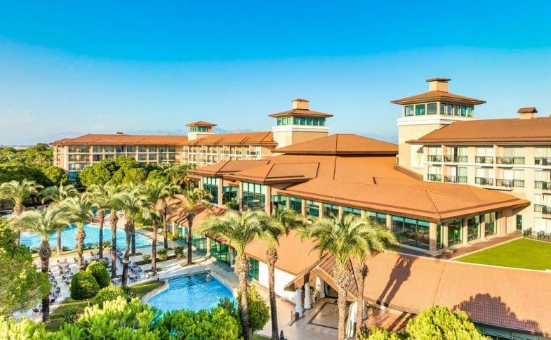 | Rozlehlý komplex je vsazen do udržovaných travnatých zahrad se vzrostlými palmami a borovými háji s jezírky. Tvoří jej členitá hlavní 6podlažní budova, areál soukromých vilek a bungalovů a velký spletitý bazénový areál v přední části, která přechází k pláži (hotelu náleží o délce 200 m). Uvítá Vás velká elegantní vstupní hala s recepcí, lobby a výtahy. K dispozici Vám bude pestrá škála společných prostor a služeb: směnárna, bankomat, celkem 5 konferenčních a zasedacích místností různých velikostí, business centrum, salónky, herna, společenské místnosti, nákupní arkáda, kadeřnictví, diskotéka, noční klub aj. Zajisté Vás potěší hotelové Spa a wellness centrum s vnitřním bazénem pro dospělé (252 m2) a pro děti (8 m2), vířivkou, saunou, tureckou lázní a nabídkou široké škály masáží, kosmetických a revitalizačních procedur. Nechybí výtečně vybavené fitness centrum. Stravovací služby obstarávají: hlavní velká restaurace Sofra s vnitřní i venkovní částí a s dětským sektorem a dalších 5 a´la carte tematických restaurací (mexická, asijská, italská, turecká, rybí). K posezení u kávy a nápoje Vám poslouží celkem 7 barů a kavárna (lobby, disco, pool, plážový, snack aj.). Rozlehlá venkovní část (přes 4000 m2) je protkaná bazény s ostrůvky a přemostěními a nabízí: hlavní bazén (1 400 m2), dále relaxační a animační bazén (687 m2 a 540 m2), celkem 3 samostatné dětské bazény (12, 89 a 380 m2) a aquapark se skluzavkami a tobogány pro dospělé i pro děti (212 m2). Sluneční terasy jsou rozseté v zahradách a kolem bazénů, mají slunečníky a lehátka (v ceně, rovněž na hotelové pláži, pavilónky za poplatek). K aktivnímu odpočinku budete mít k dispozici dlouhou řadu možností: tenis (4 kurty), squash, bowling, minigolf, volejbal, basketbal, minifotbal, stolní tenis, šipky, kulečník, lukostřelbu, herny aj. Resort pořádá nespočet denních i večerních animačních programů (pro děti i dospělé: soutěžní, sportovní, zábavní, různé kurzy jako jóga, pilates aj.). Nechybí společenské večery s vystoupeními a diskotékou. Pro nejmenší hosty je zde dětský klub s celodenním programem a aktivitami. Na pláži budete moci využít služeb střediska vodních sportů, plážový volejbal aj. |