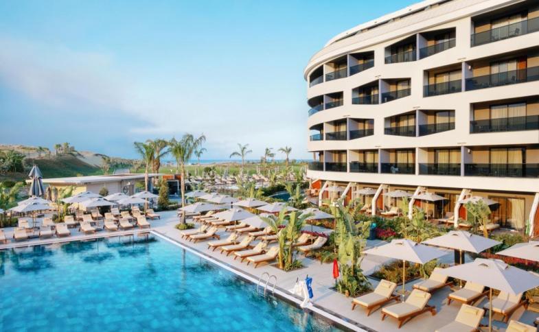 | nový 5* hotel (2021) ležící na podlouhlém pozemku o rozloze 54.000 m2 s dlouhou minimalistickou zahradou a písečnými dunami u krásné 20.000 m2 velké písečné pláže s pozvolným vstupem do moře (štěrk a oblázky u vstupu). Celý komplex se nachází na konci letoviska Manngvat a je pravou oázou pohody, zábavy a relaxace. Hotelová zeleň je ohraničena písečnými dunami, které přechází v dlouhou písečnou pláž. Zde najdete vynikající intimní koktejlový bar, hudební stage a veškerý servis včetně celodenní restaurace, velké plážové pavilony s batlerem a středisko vodních sportů. Letiště je vzdálené 48 km, centrum Antalye 56 km a centrum Side 12 km. |