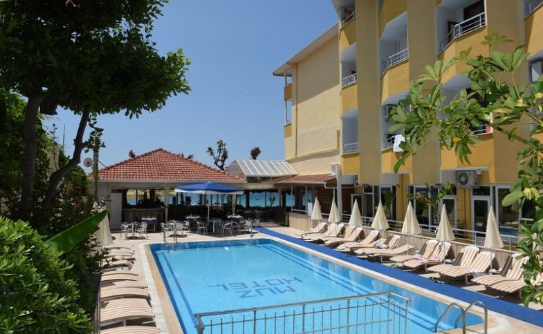 ...pro nenáročné, kteří se jedou především koupat v moři a opalovat. Výhodou je pláž s obsluhou hned u hotelu. Voda čistá, zážitkem je plavání s želvami karetami cca 200 m od břehu, kde se pasou na mořské trávě. Pokoje jsou menší, ale jedná se v podstatě jen o přespání a koupelnové zázemí, takže se s tím vydržet dá. Snídaně fádní, balkánský sýr s pažitkou, s koprem, s česnekem, s ničím, výrobní salám, zelí a rajčata stokrát jinak, vajíčka natvrdo, drobivý chleba, margarín převlečený za máslo, přeslazený džem... Po čtyřech dnech jsme vyrazili na snídani do města. Večeře slušné, denně maso, problém ale pro alergiky na česnek - ten je takřka ve všem... Půlka hostů mluví sovětsky. Během našeho pobytu bylo většinu dní horko až 43 stupňů, takže na nějaké výlety (kromě do samošky Migros pro chlazené nápoje - ale pozor při donášení do hotelu, neradi to vidí) nebylo ani pomyšlení.