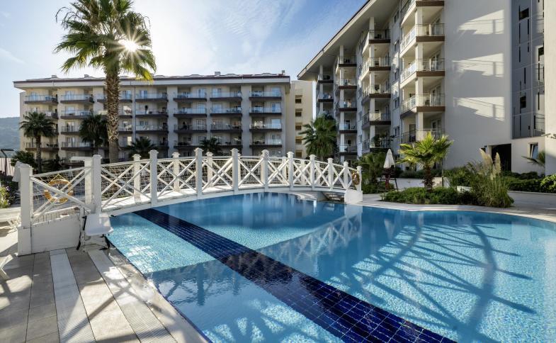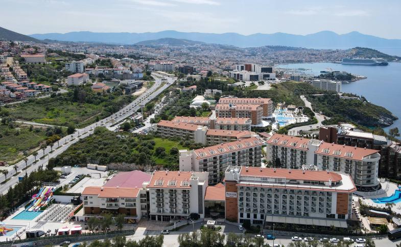 Moderní hotel se rozkládá na rozloze 20.000 m2, nedaleko centra města Kusadasi. Díky své poloze nabízí ideální možnosti k prozkoumání tohto města i blízkých památek a úchvatné výhledy na pobřeží Egejského moře. Zázemí hotelu s několika bazény a aquaparkem je ideální volbou nejen pro páry, ale i pro rodiny s dětmi.Vzdálenost