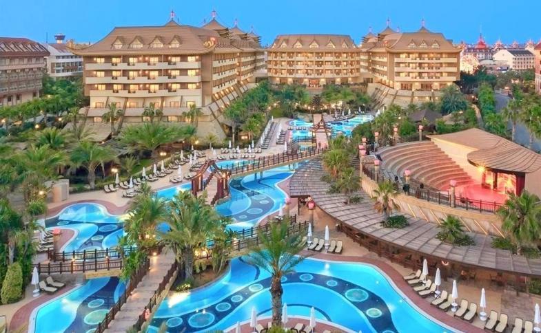 Vstupní hala s recepcí, hlavní restaurace s terasou, 4 restaurace à la carte za poplatek (turecká, italská, rybí a speciality Dálného východu), cukrárna, několik barů, konferenční místnosti. Venku bazén, samostatný bazén pro děti a aquapark se skluzavkami, lehátka, slunečníky a osušky u bazénu zdarma.
