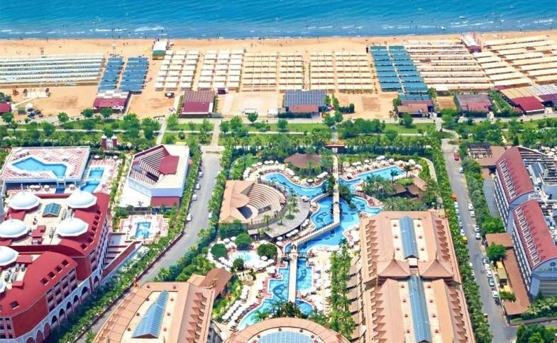 Komplex (50 000 m2) oddělený od pláže pouze promenádou. Cca 6 km od antického města Side.