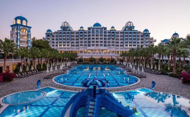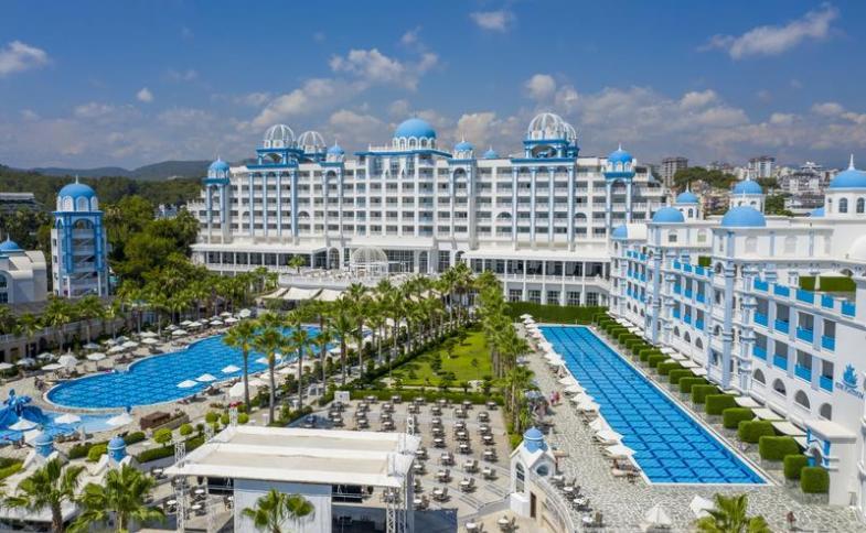 | Areál tvoří hlavní vícepatrová budova v bílé a modré barvě a několik dependance budov vsazených do udržovaných zahrad a obklopených vzrostlými palmami. V přední části se pozemek dotýká dlouhé a široké pláže. Písečná část tvoří úsek 180 m z celkových 300 m. Další část je kamenitá přírodní s dřevěným molem zapuštěným do moře. Uvítá Vás elegantní vstupní hala s recepcí, lobby a výtahy. Ve vnitřní části můžete využívat společenské místnosti, salónky, business centrum, konferenční prostory, směnárnu, knihovnu, hernu, dětský kout, kadeřnictví, obchodní arkádu aj. K relaxaci přijde vhod hotelové Regius centrum) s vnitřním bazénem, tureckou lázní, saunou, vířivkami, relaxační místností, možností masáží a řady kosmetických a revitalizačních procedur. Samozřejmostí je profesionálně vybavené fitness centrum. Stravovací služby obstarává hlavní bufetová restaurace, dále a´la carte restaurace The Red Lounge a Bistro Terassa a´la carte restaurace. O příjemné posezení u kávy a dobrého nápoje se postará celkem 6 barů (snack, pool, beach, vnitřní aj.). Venkovní areál nabízí 2 velké hlavní bazény,2 x samostatný dětský bazén, brouzdaliště, aquapark s tobogány a skluzavkami a prostorné sluneční terasy s lehátky a slunečníky (v ceně, rovněž na hotelové soukromé pláži, pavilonky na molu za poplatek). K aktivnímu odpočinku slouží animační programy pořádané hotelem-aerobik, vodní polo, zumba, vodní gymnastika. Zahrát si můžete tenis, stolní tenis, painball, basketbal, šipky, plážový volejbal, pétanque, dále možnost lukostřelby, minifotbal aj. Nechybí nabídka společenských programů pořádaných v hotelovém amfiteátru: taneční vystoupení, diskotéka aj. Pro děti je připraven dětský klub s nespočtem denních aktivit. Na pláži pak nabídka střediska vodních sportů. Parkování pro hotelové hosty je samozřejmostí. |