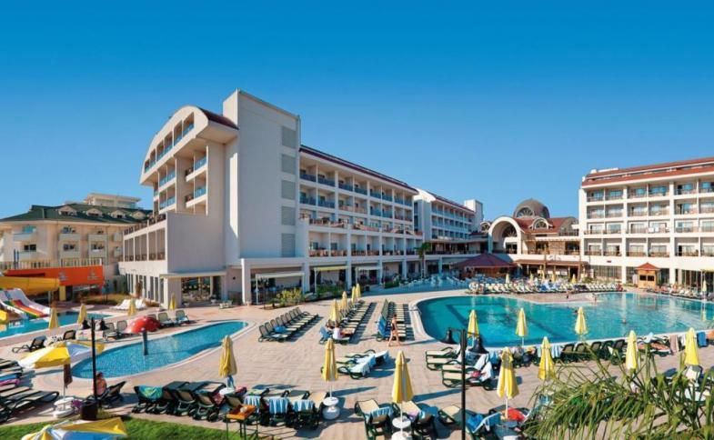 Pětihvězdičkový hotelový resort se nachází 300 m od písečné pláže oceněné Modrou vlajkou. Hotel je vhodný pro rodinnou dovolenou. Pro děti je zde bazén se skluzavkami, dětský bazének, miniklub nebo zábavné animace. Hotelové SPA centrum nabízí možnost relaxace při masáži, v sauně nebo tureckých lázních. Sportovně založení klienti ocení fitness nebo možnost zahrát si plážový volejbal. All Inclusive stravování dodá vaší dovolené komfort a možnost ochutnat místní kuchyni. Letiště v Antalyi je vzdálené 55 km. |