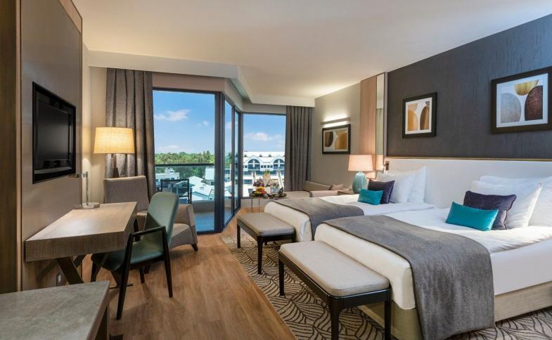 Pokoj deluxe - standardně pro 2 dospělé osoby (osoby navíc na přistýlce nebo 2 postele typu queen); klimatizace, telefon, TV, minibar, set na přípravu kávy / čaje, trezor; vlastní příslušenství (WC, vana nebo sprchový kout, vysoušeč vlasů). Za příplatek výhled na moře.Rodinný pokoj - 2 propojené pokoje deluxe.