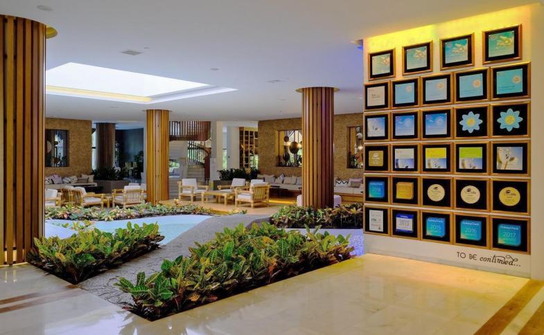 253 pokojů umístěných v hlavní budově (3 výtahy) a budovách v zahradě, vstupní hala s recepcí, hlavní restaurace, 2 restaurace s obsluhou (turecká, mezinárodní), bary, snack bary, konferenční místnosti, lékař, obchody, obchod se suvenýry, fotograf, kadeřník, prádelna, SPA centrum, relaxační zóna, venkovní kino, 2 bazény, dětský bazén, vnitřní bazén, lehátka, slunečníky a osušky zdarma, paviliony za poplatek.Pokoje
