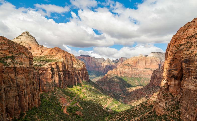 - Po snídani opustíme záři neonů Las Vegas a vydáme se do světa, kde si příroda pohrála s každým kamenem – do národního parku Zion. Tento klenot Utahu je známý svými monumentálními pískovcovými útesy v odstínech červené, oranžové a zlaté, které se tyčí k nebi jako věže katedrály. Scénická cesta Zion Canyon Scenic Drive nás zavede k vyhlídkám, odkud uvidíme ikonické vrcholy jako The Watchman nebo Angels Landing. Pro milovníky dobrodružství je tu možnost projít část slavného The Narrows, kde stezka vede přímo korytem řeky mezi úzkými skalními stěnami. Ti, co chtějí klidnější tempo, si mohou užít vyhlídkové zastávky, fotografování a nasávání ticha tohoto posvátného místa, které kdysi obývali indiáni kmenů Paiute a Anasazi. Návrat na hotel, nocleh.
